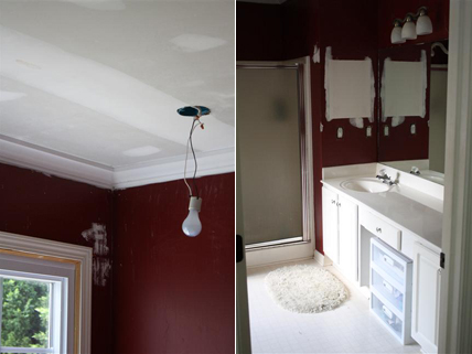Yeahhhh…. about the master bathroom. It’s our most neglected, most annoying, most debated (among us) room in our house. We removed a bunch of the stuff in the room when we bought it, then patched the sheetrock but never even painted it. It STILL looks like this.